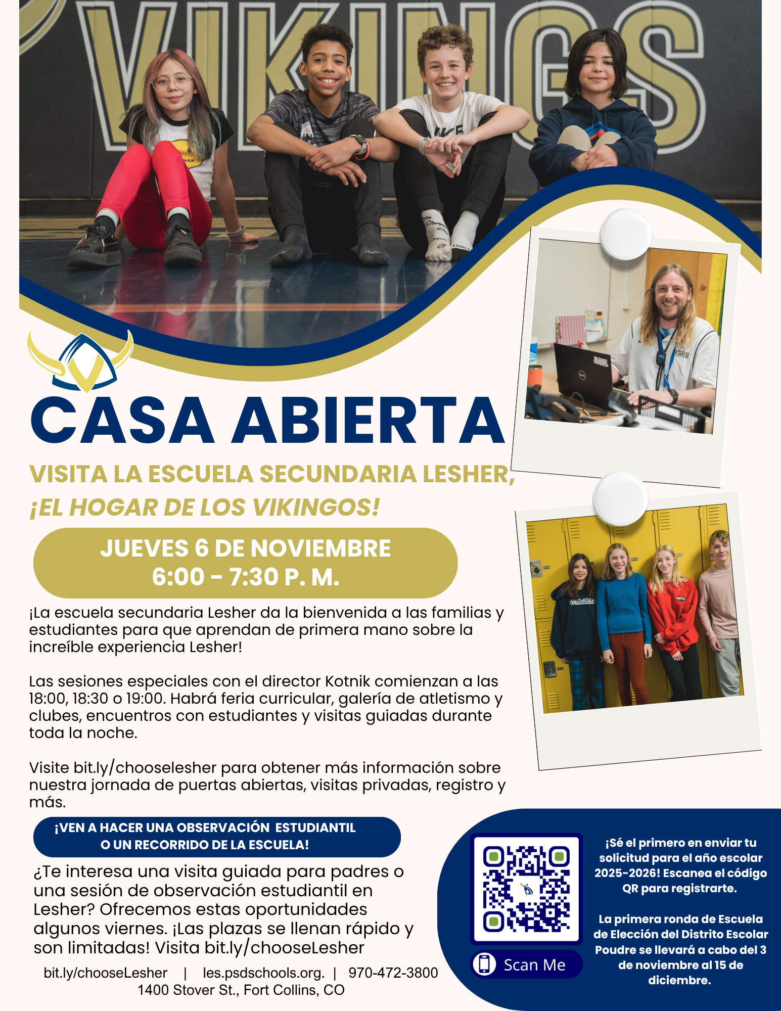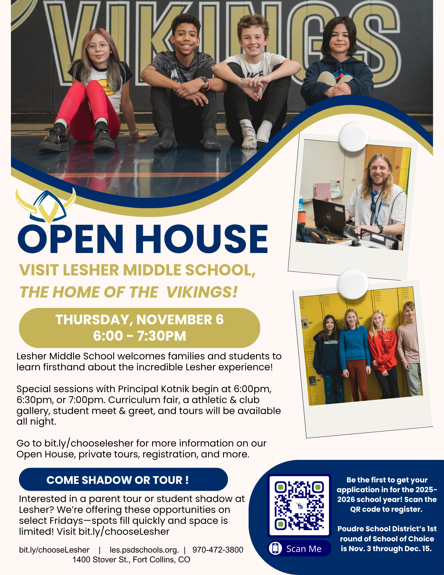 Please join us at our Open House November 6th, 2025 from 6-7:30pm. If you are unable to attend the Open House and would like a tour of Lesher please email ztraver@psdschools.org (Zac Traver, 6th Grade Counselor)